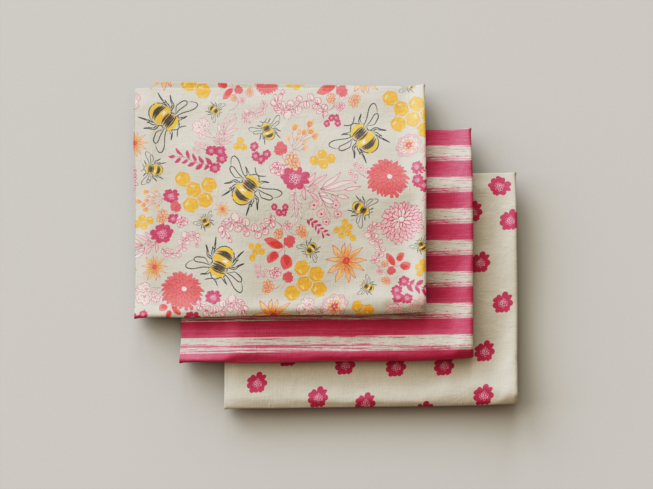 The colour palette blends golden yellows, soft creams, warm pinks, and honeyed neutrals, giving the design an inviting, sunlit quality that translates beautifully across a wide range of products. The balance of organic movement and considered spacing makes this seamless pattern especially versatile for fabric, stationery, and giftware applications.